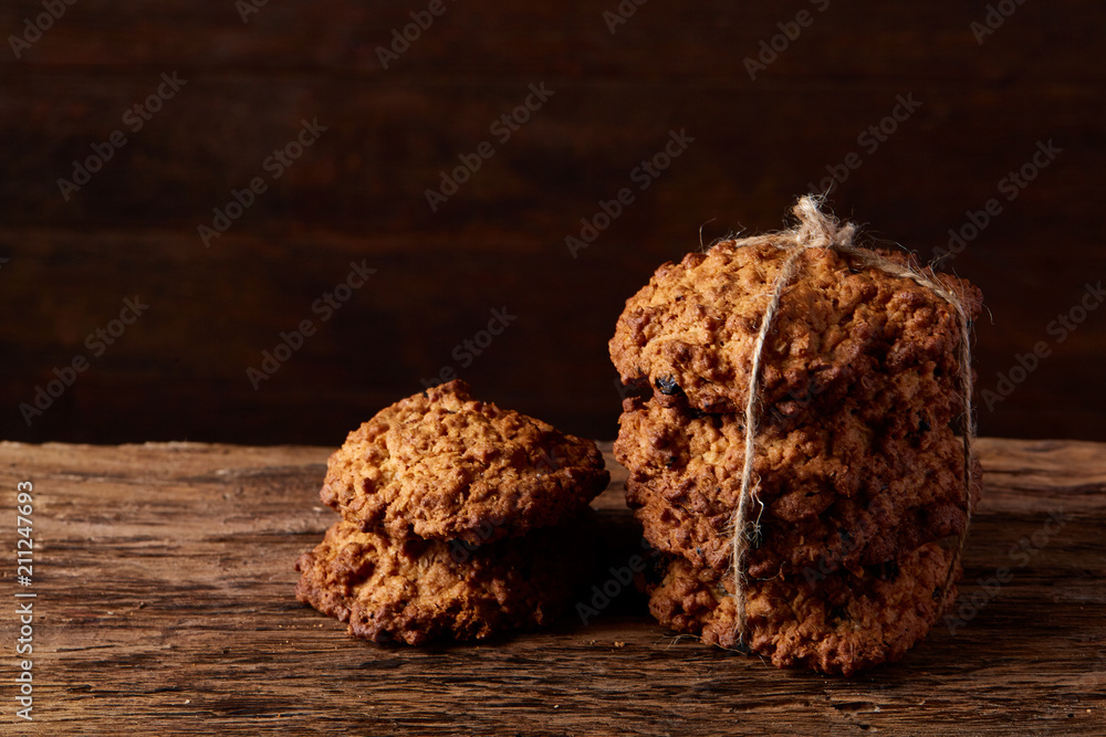Christmas concept with cookies and decorations on a log over wooden background, selective focus