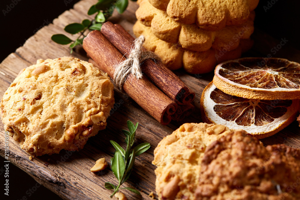 Christmas concept with cookies and decorations on a log over wooden background, selective focus