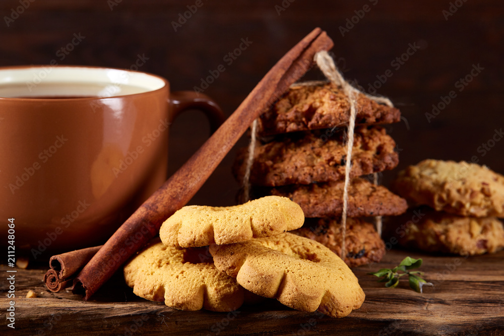 Traditional Christmas tea concept with a cup of hot tea, cookies and decorations on a wooden background, selective focus