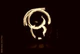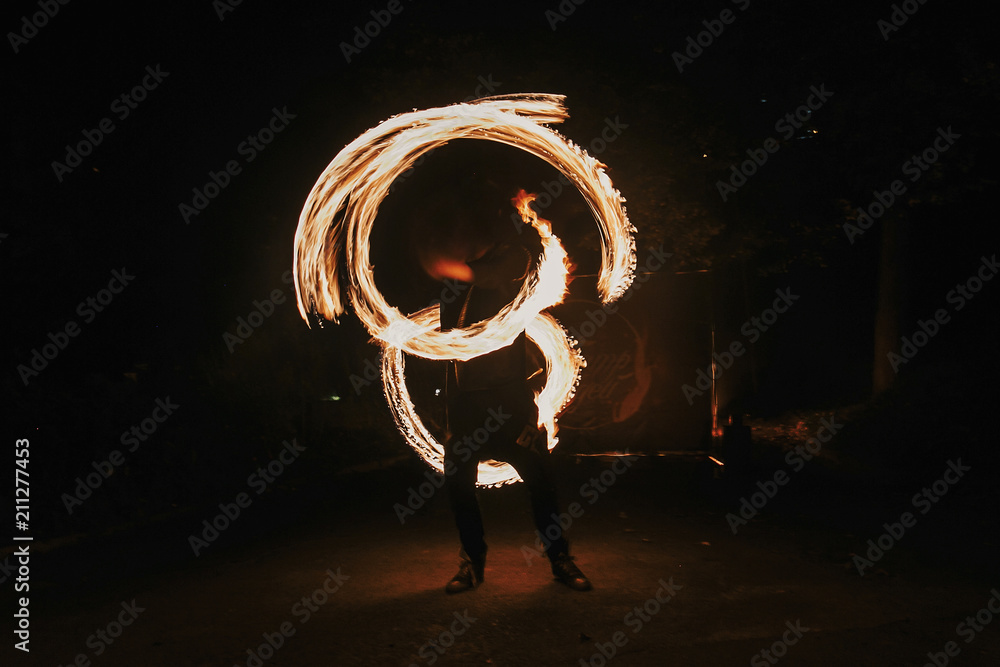 amazing fire show at night at festival or wedding party. Fire dancers swing, spinning fire and man juggling with bright sparks in the night. fire show performance and entertainment