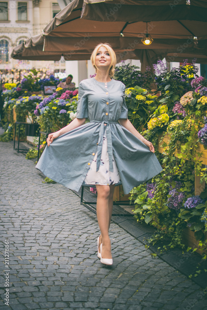 Beautiful young lady wearing coat over dress with heels walking on city street.