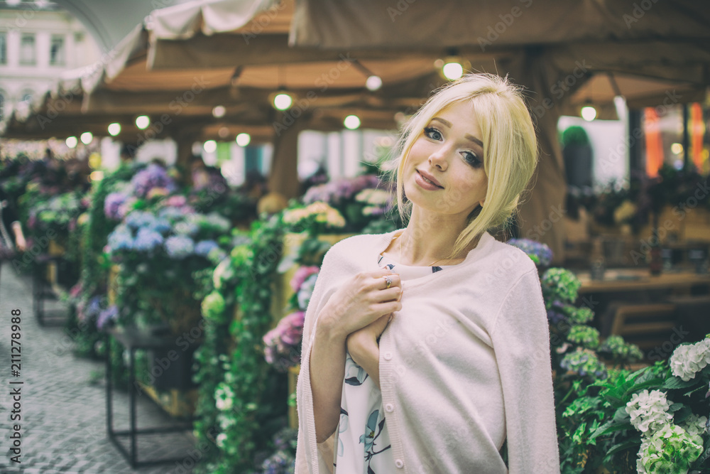 Beautiful young blonde woman with sweater thrown over the shoulders on the city street.
