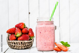 Fruit milkshake with strawberries, jar of smoothie with dessert strawberry, healthy breakfast and vegetarian food concept