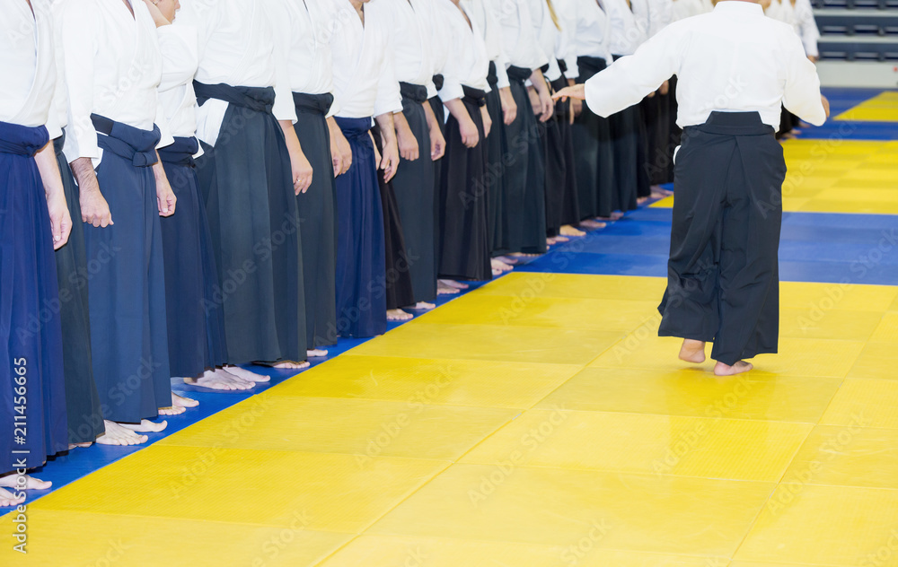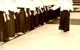 People in kimono and hakama standing in a line on tatami