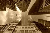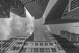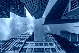 A plane flying over the modern blue cubic buildings located at The Hague city, Netherlands
