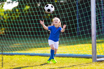 Kids play football. Child at soccer field.