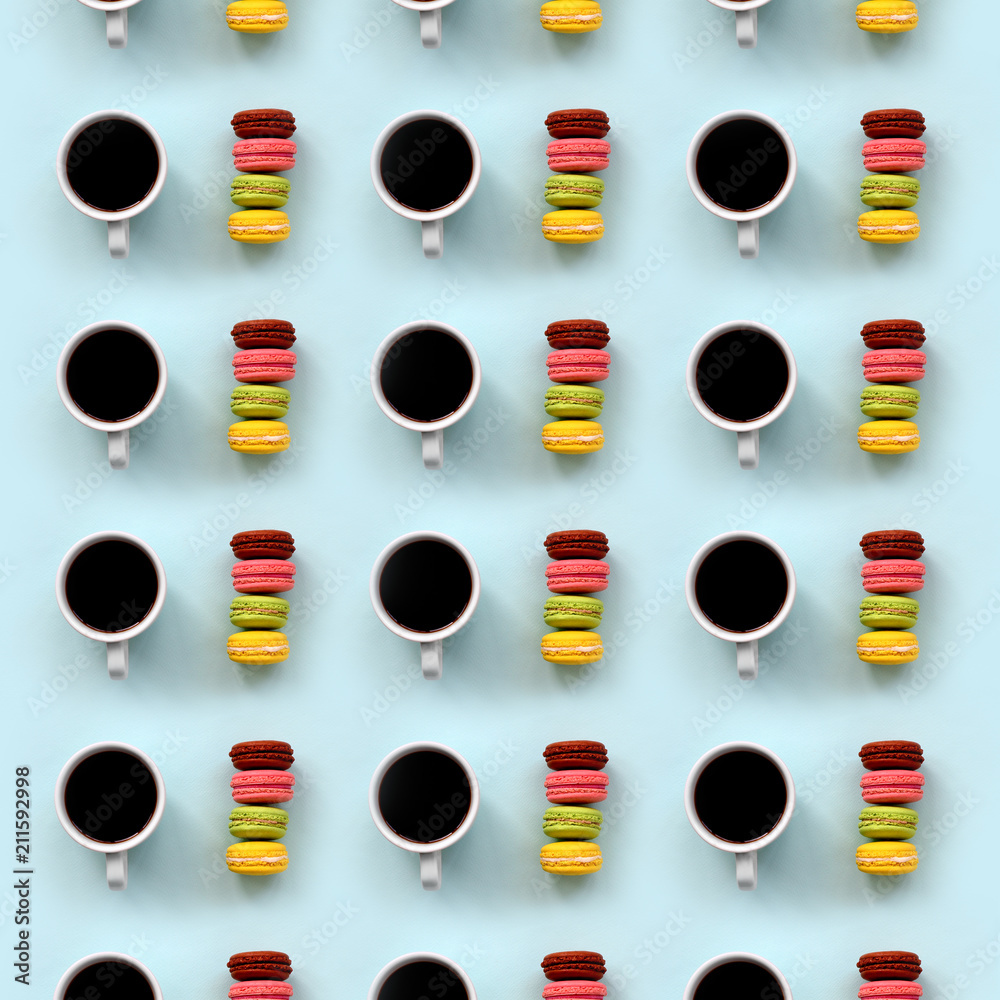 A pattern of many colorful dessert cake macaroon and coffee cups on trendy pastel blue background top view. Flat lay composition