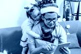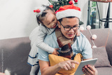 Father and daughter sitting on sofa and select christmas present and shopping from online store by tablet at xmas party,holiday gift giving festive.