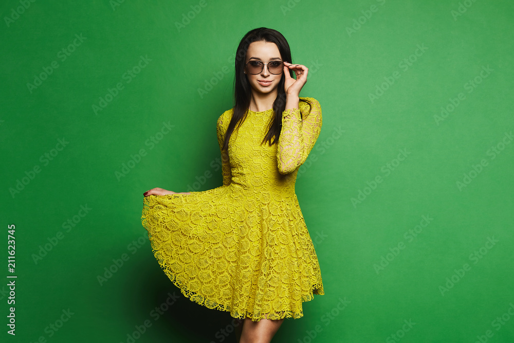 Beautiful, sexy and fashionable brunette model girl in short yellow dress and sunglasses pulls up the hem of her dress and posing at green background at studio