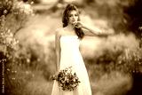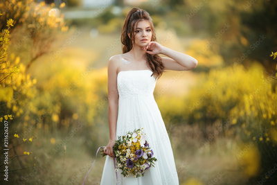 Beautiful happy bride is wearing white fashion dress holding bouquet of wildflowers in yellow field, nature wedding concept