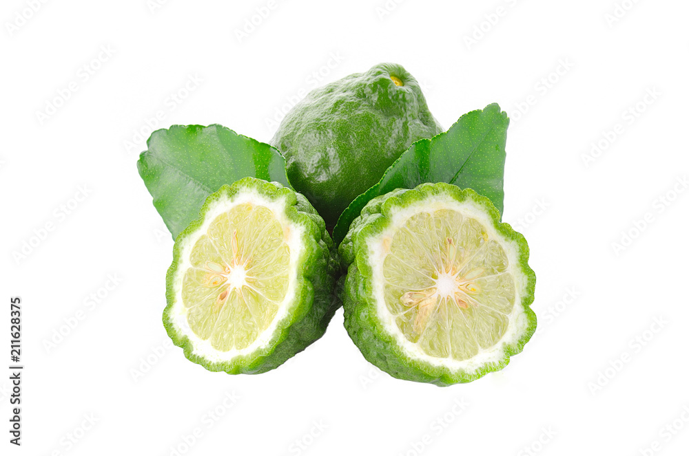 Lime and leaves on a white background.
