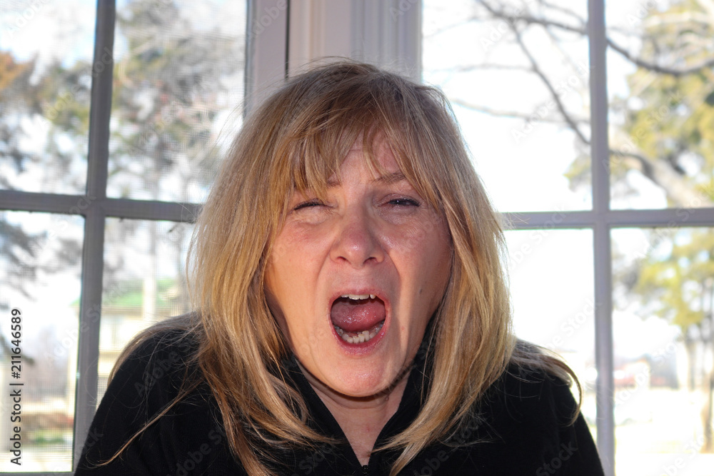 Blond middle aged woman screams with squinted eyes and mouth wide open in front of window showing bllurred green leaves outside