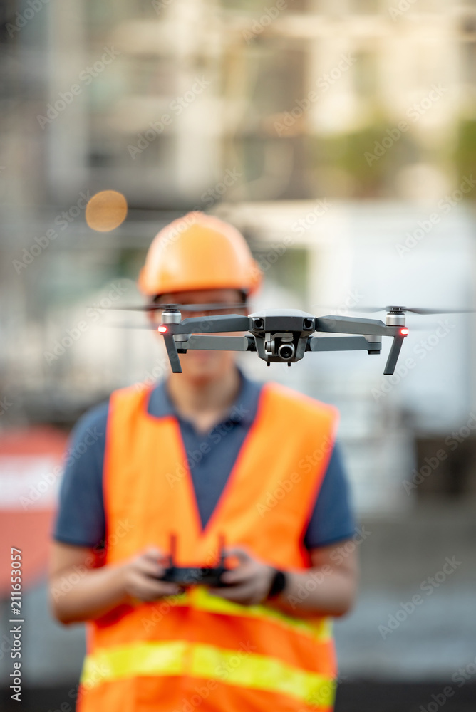 Young Asian engineer flying drone over construction site. Using unmanned aerial vehicle (UAV) for land and building site survey in civil engineering project.