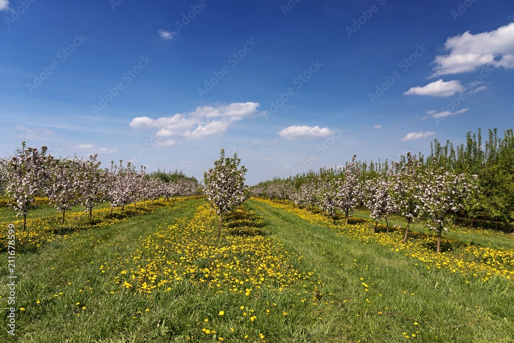 wiosenny kwitnący sad z pięknym błękitnym niebem i kwitnącymi na żółto mleczami