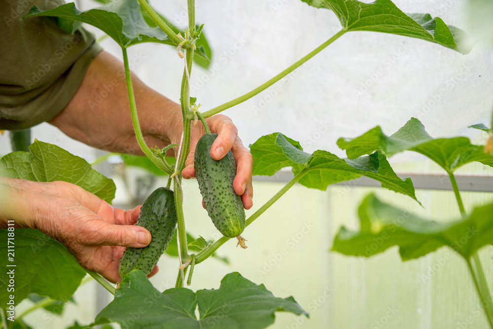 Woman farmer hands picking a cucumber, close up hand, organic farm.