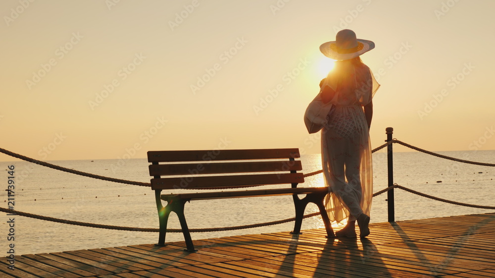 A pretty, slender girl in a developing pareo and a wide-brimmed stylish hat is standing on the pier, admiring the sunrise and enjoying the peace and tranquility.