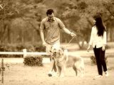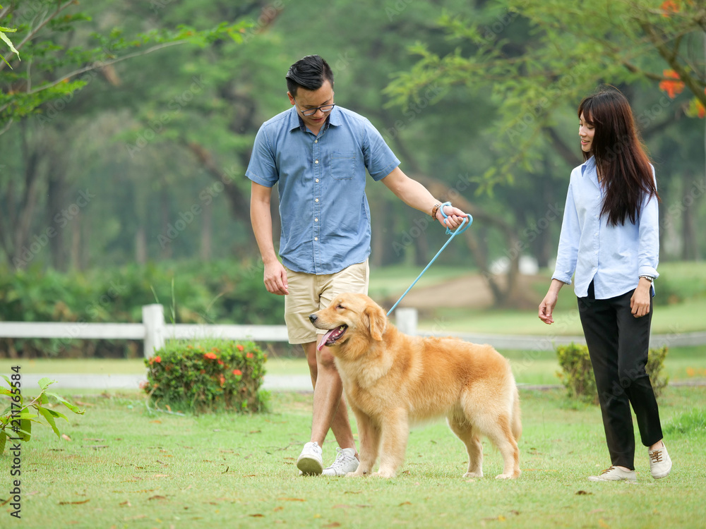 Asian couple lover walking with a cute golden retriever dog in the park together afther finish work.
