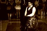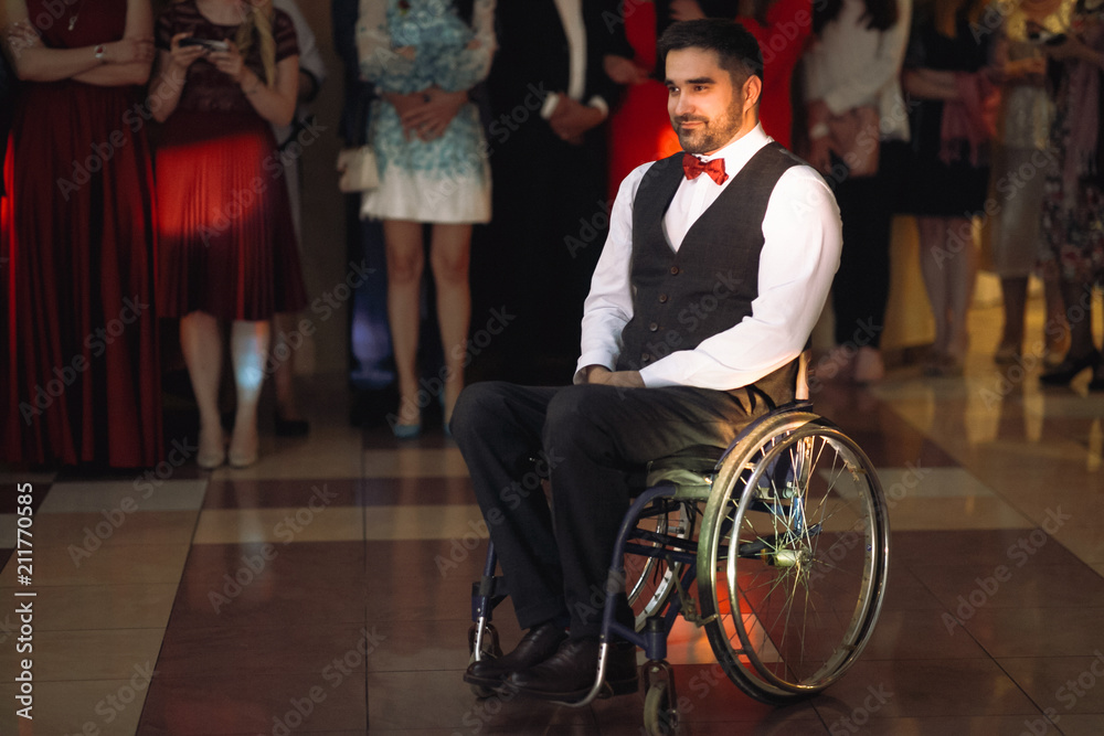 Handsome groom on the wheelchair waits for a bride in the center of dancing floor