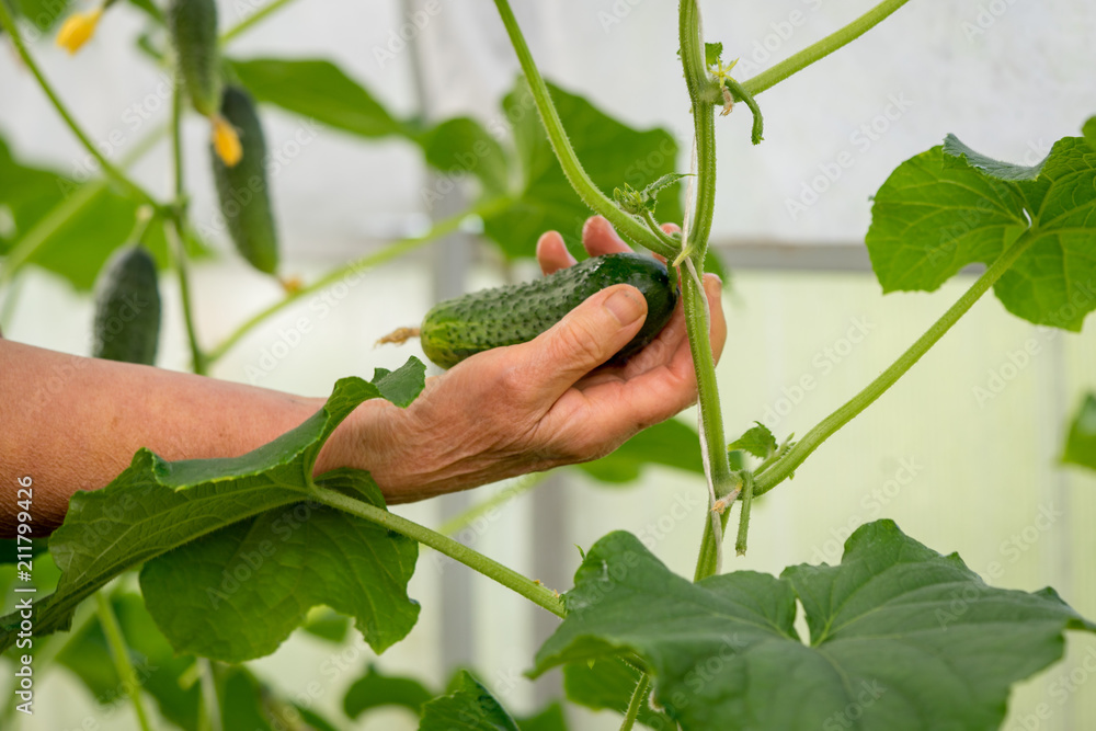 Close up of elderly woman hands picking up cucumbers. Healthy eating. Gardening and agriculture concept.