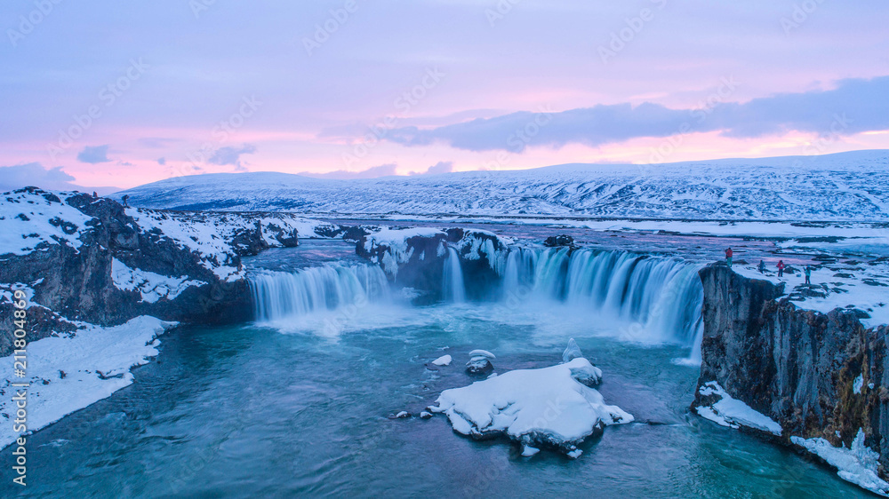 The Godafoss is a waterfall in Iceland. Aerial view and top view.