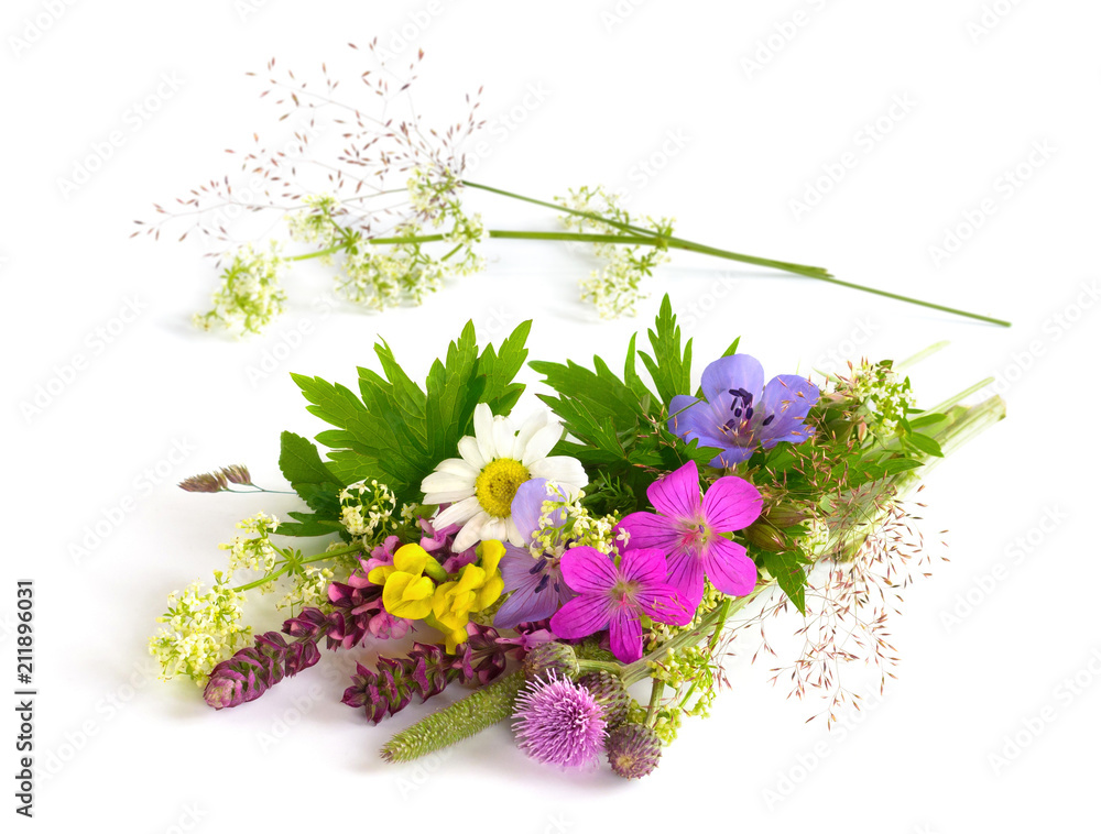 Bouquet of wild flowers on white background
