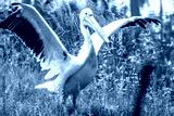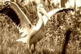 Great white pelican in nature. Rosy pelicans family. Wild bird with spread wings. Animal in zoo.
