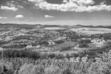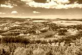 Countryside landscape in the valley, panoramic view of town with houses on foothills with green forest