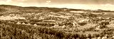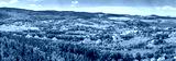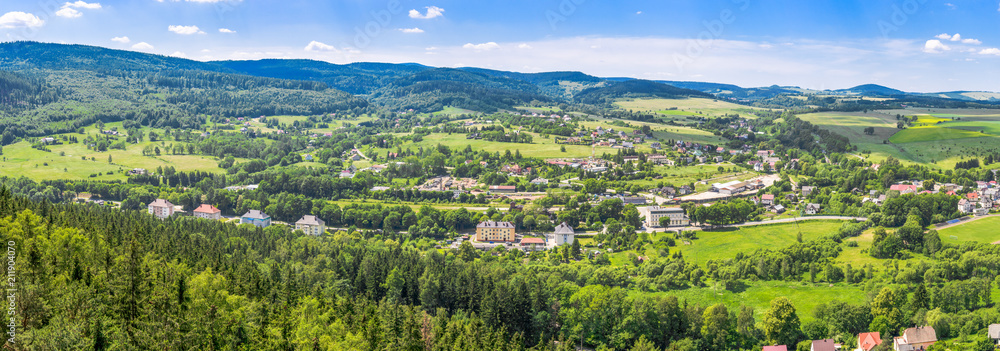 Panorama of mountain valley, town landscape. Green nature and houses, aerial view