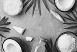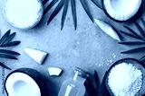Blue background with set of organic coconut products for spa treatment, cosmetic or food ingredients. Oil, water and shavings top view. Flat lay.