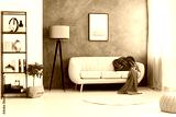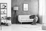 Poster mock-up on a gray, concrete wall and a leather beige settee in an industrial living room interior with black, wooden furniture