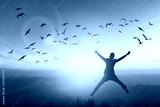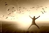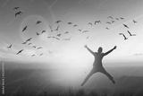 Happy man rise hand on morning view. Christian inspire praise God on good friday background. Now one man self confidence on peak open arms enjoying nature the sun concept world wisdom fun hope.