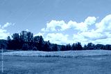 Treelined field and bright blue sky with white clouds. Summer in Ithaca, New York