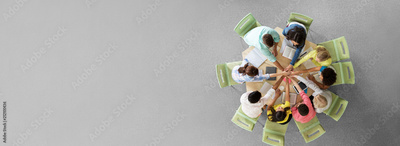 education, teamwork and people concept - group of international students with books and tablet pc computers putting hands on top of each other sitting at round table