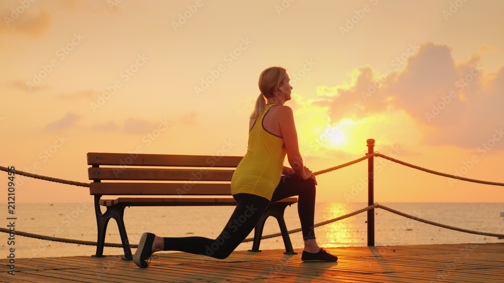 A young athlete makes a morning warm-up on the sea pier of a cool morning against the background of the rising sun
