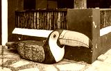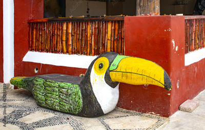 Wooden bench carved into a toucan bird shape sitting on mosiac sidewalk against bambo and stucco wall in Mexico