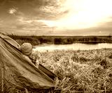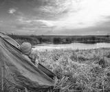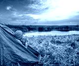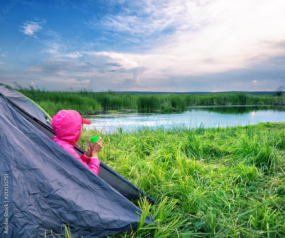 Girl in pink jacket sits at the exit of tent with mug and looks