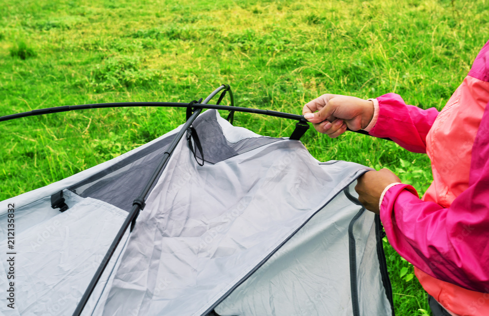Hands of girl in pink jacket collecting tourist tent