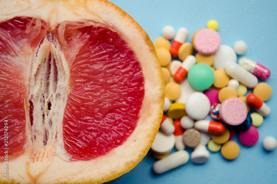 A fresh grapefruit and colorful pills on a blue background. Concept medicine for women's health