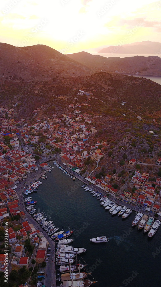 Aerial birds eye view photo taken by drone of Yalos, iconic port of Symi island at sunset with beautiful clouds, Dodecanese, Greece