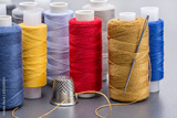 Vertical row of coils with bright colored threads, large needle and thimble.