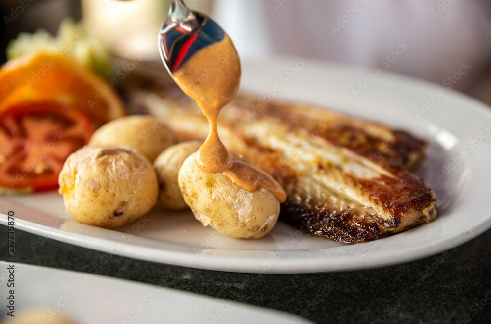 Close up of tasty fried fish and sea fruits with potato and sauce from tomato and chili re paper. Delicious restaurant food near ocean in Spain, Canarias island. Traditional Canarias dish.