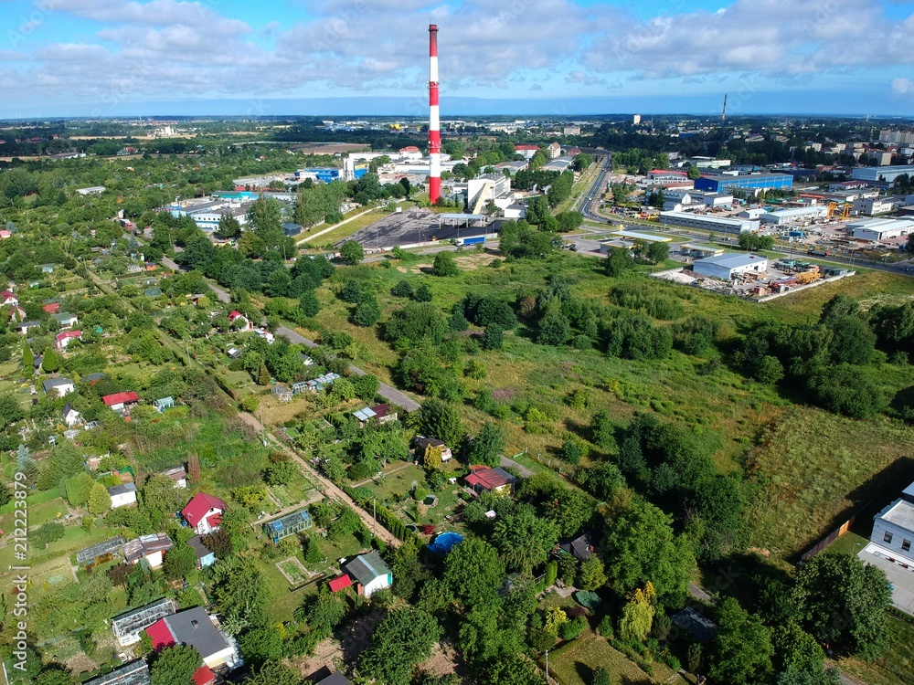Heating plant with high chimney in city, close to the allotment gardens, aerial view