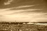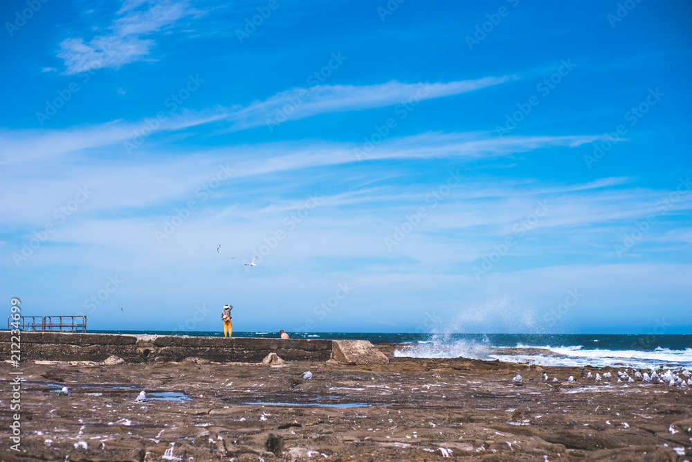 minimal scenery of blue sky and rock beach with a tiny lady standing on the edge of ocean bath in suuny day