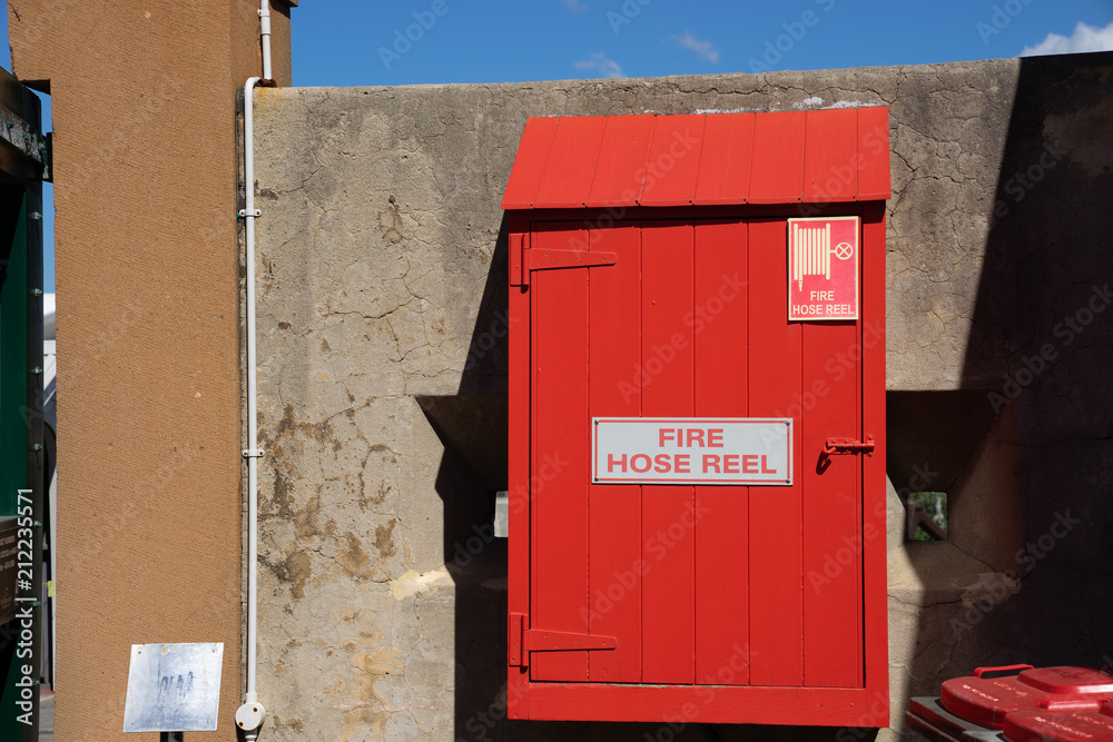a wooden red box of Fire House Reel on a loft vintage cement wall