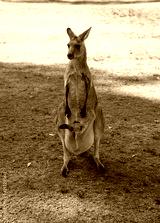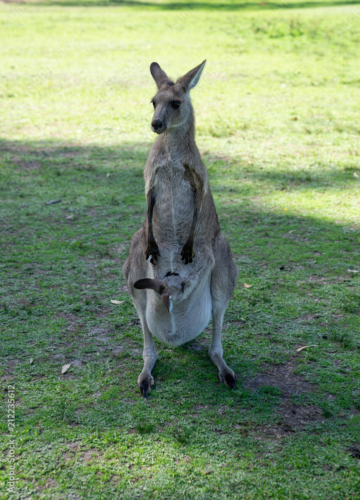 Kangaroo with her joey, baby kangaroo in mom's belly front bag in park