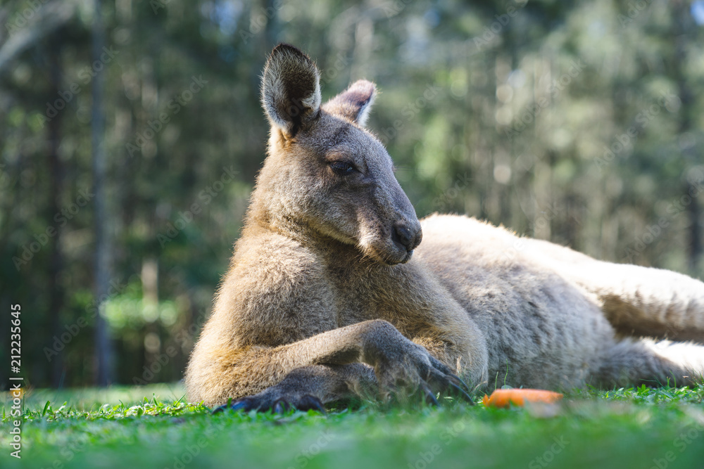 close up half body big kangaroo lies down, have a rest on green grass in park