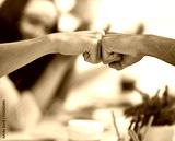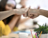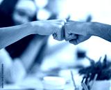 Image of 2 businesspersons fist-bumping in agreement at a meeting at office