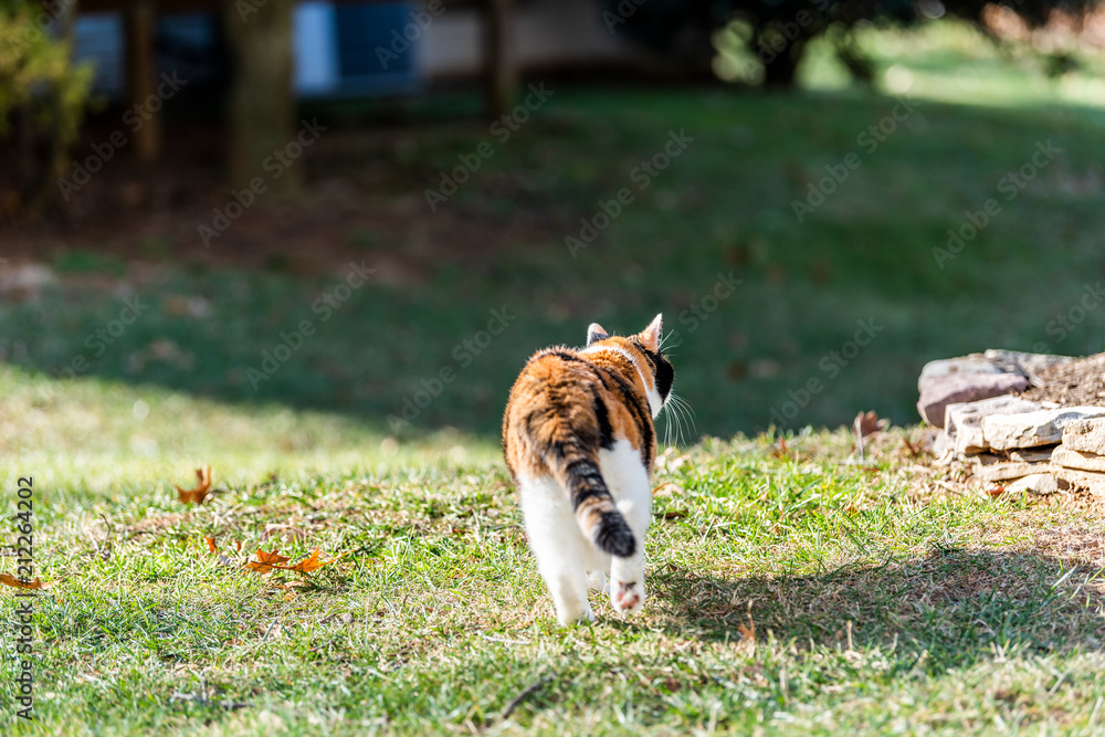 Back of outdoors calico cat outside walking in garden, curious in front or back yard of home or house, lawn, green, grass