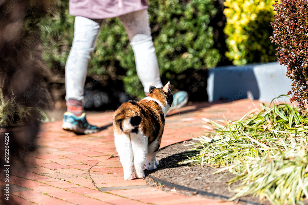 Back of curious calico cat outside, outdoors, standing in garden, in front or back yard of home or house with owner, person, woman walking paved path with bushes