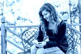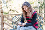 One young woman sitting on chair, holding, eating piece of homemade mochi sticky glutinous Japanese rice cake dessert outdoors, outside on deck